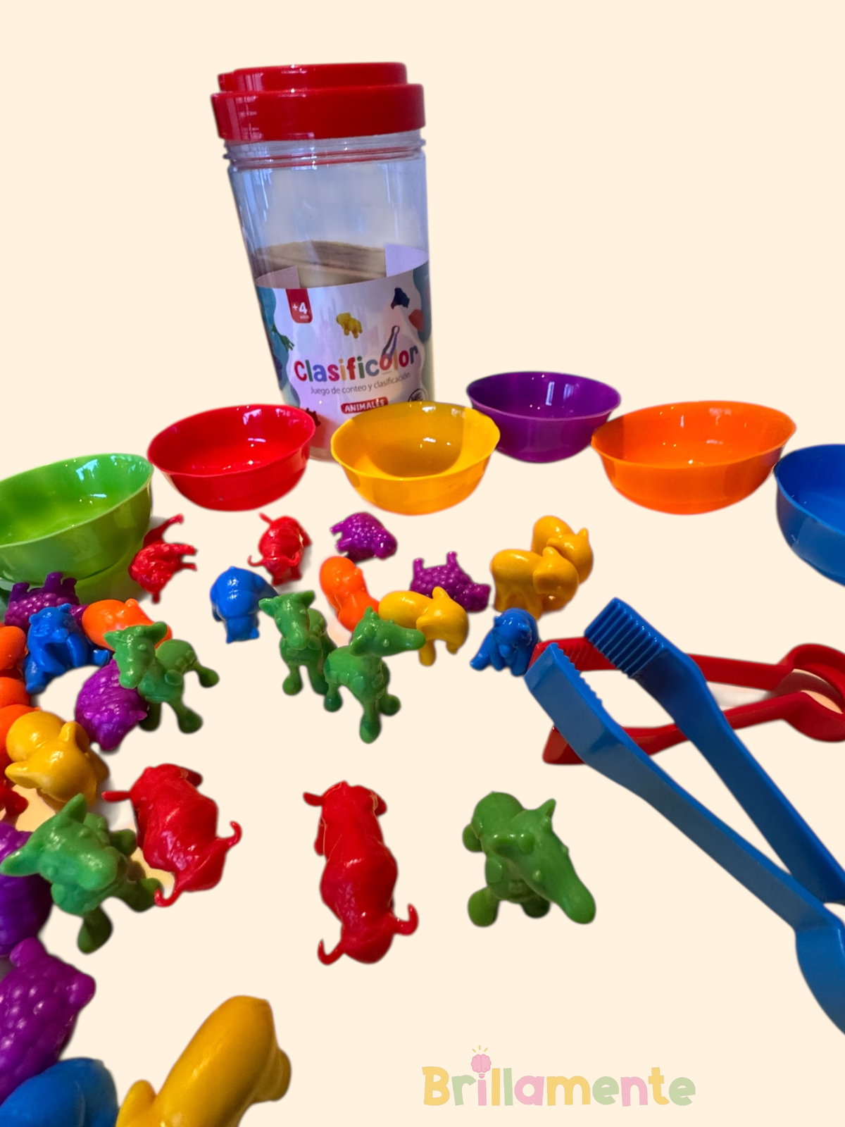 Incluye recipientes de colores, figuras de animales y pinza, invitando a los niños a explorar, clasificar, contar y organizar de forma concreta y significativa.