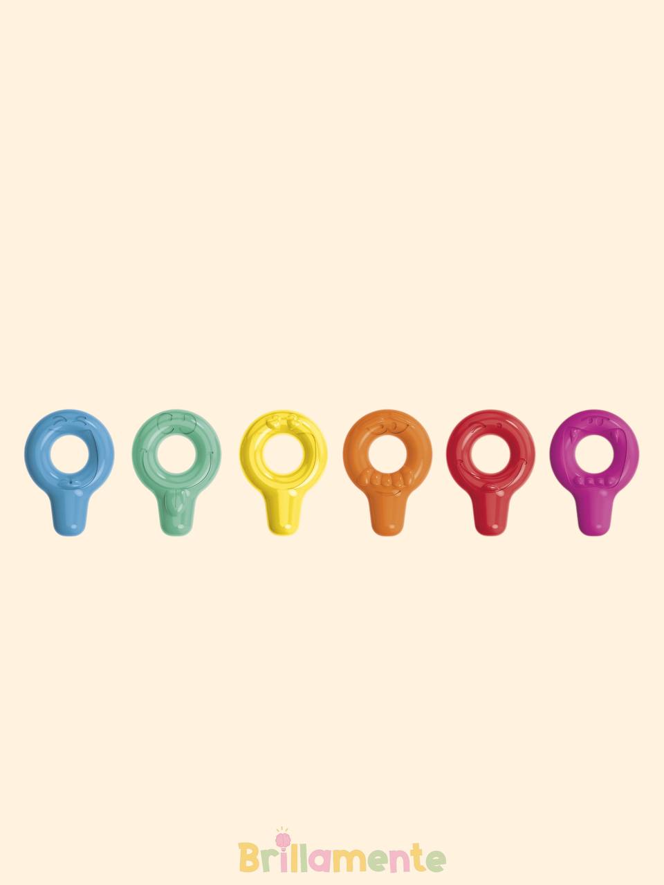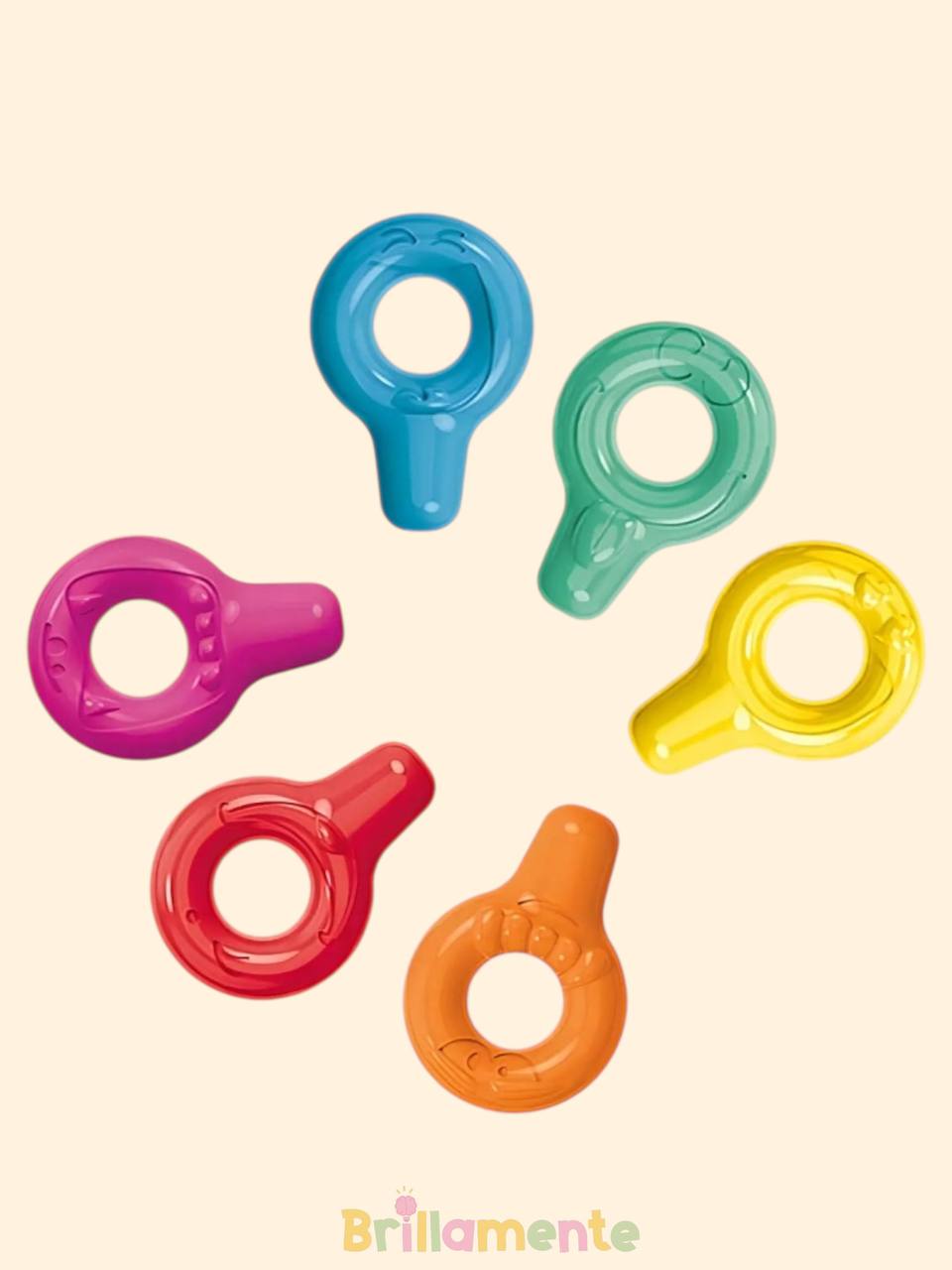 Su formato tipo anillo no solo permite insertar los dedos, sino que también pueden ser sostenidos con toda la mano.. Esta versatilidad los convierte en un recurso que se adapta a distintas formas de exploración y momentos del desarrollo.