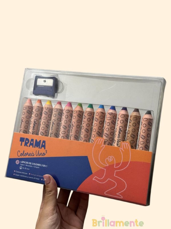 Este set de 12 lápices combina distintas formas de expresión en un solo material: funcionan como lápices de color, crayones y también como acuarelas, permitiendo explorar el color de manera creativa y versátil.