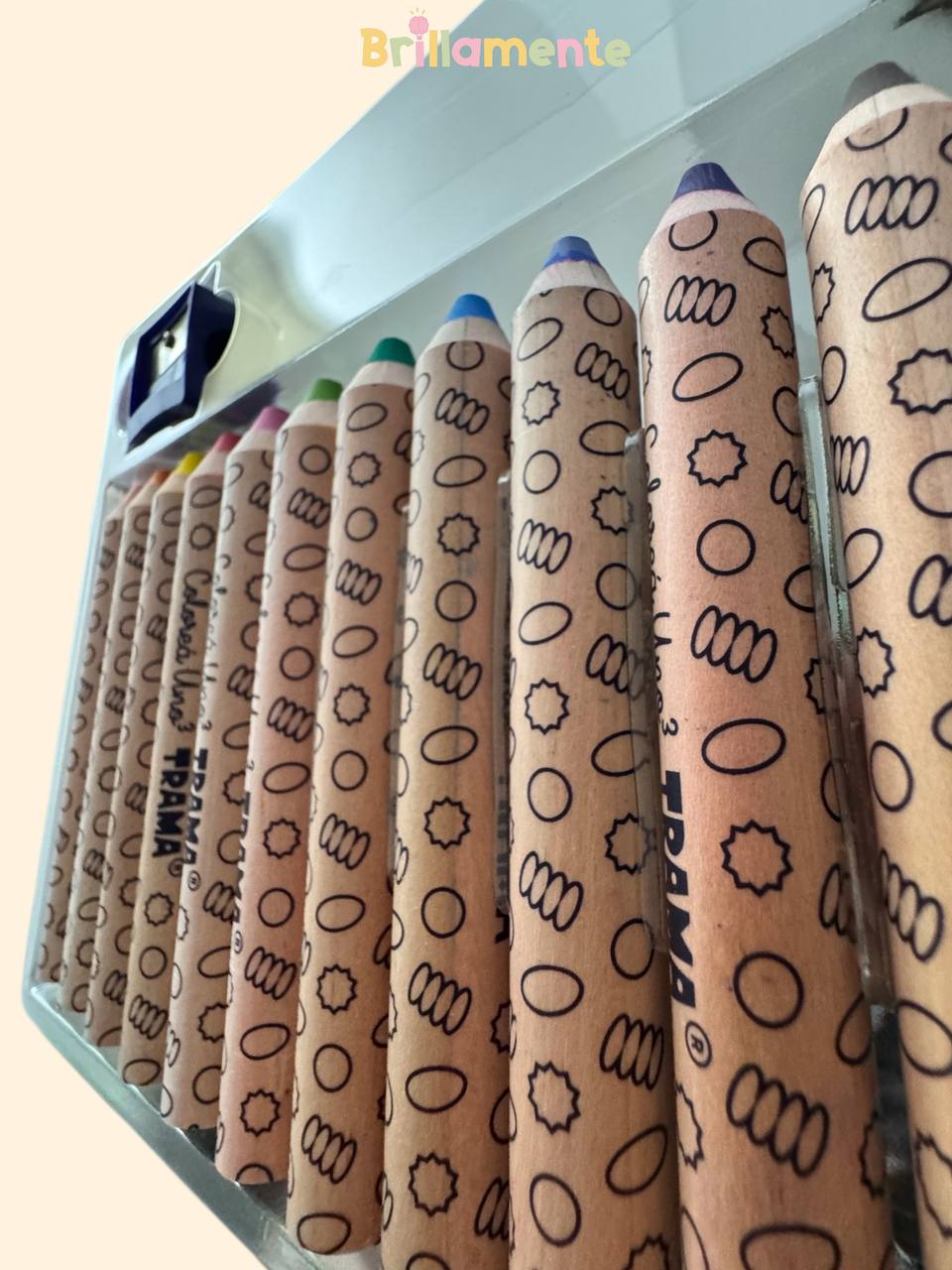 Con su formato grueso y redondo, facilita un agarre cómodo y seguro. Incluye sacapuntas, acompañando el uso práctico en cada momento.