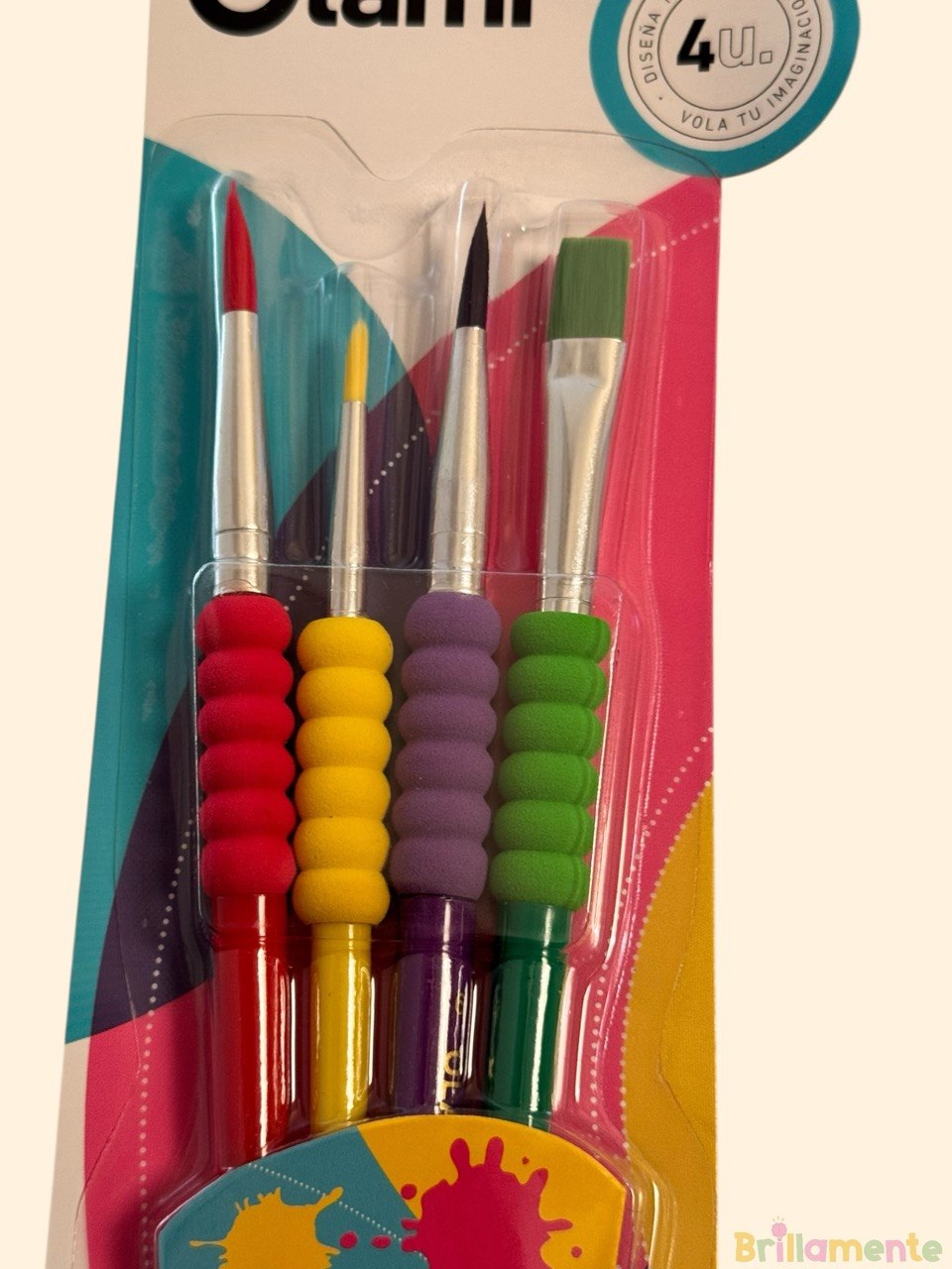 Incluye 4 pinceles con diferentes tipos de punta, ideales para explorar técnicas variadas, desde detalles delicados hasta trazos más amplios. Gracias a su diseño, los niños pueden pintar con mayor precisión y confianza, disfrutando al máximo su proceso creativo.