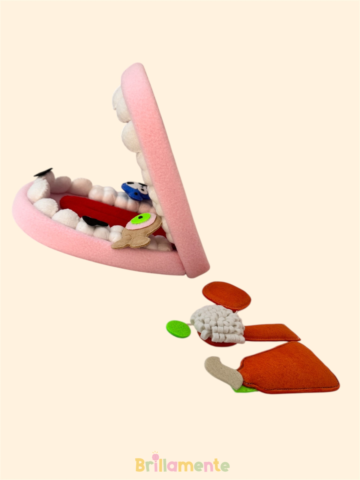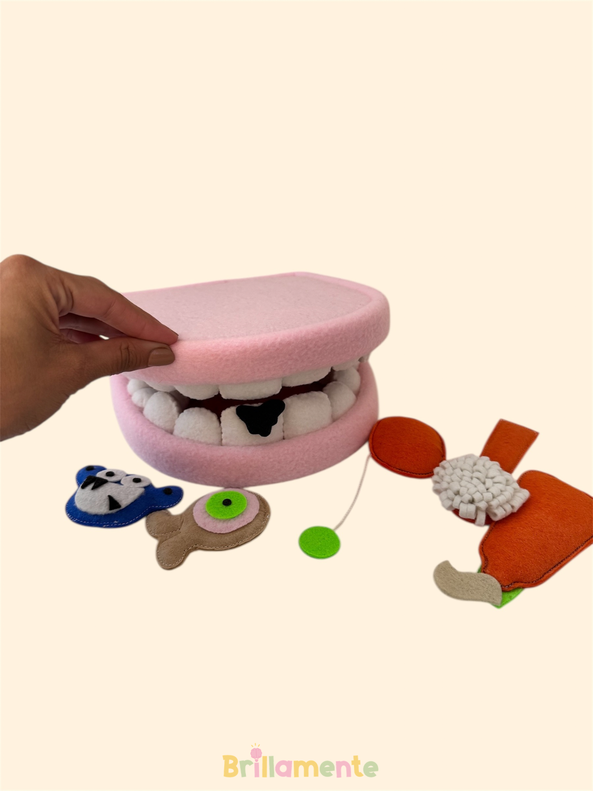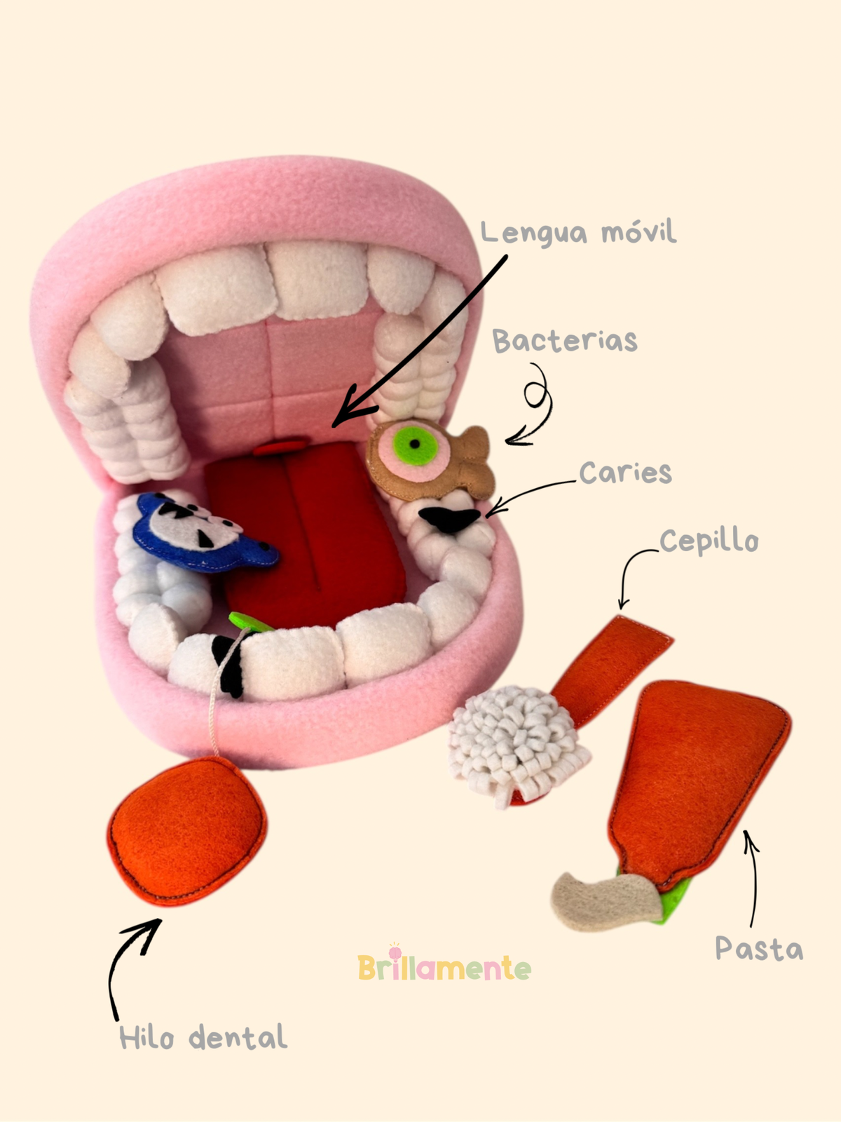 Recurso sensorial y terapéutico, su textura suave y sus piezas manipulables invitan al niño a explorar, reconocer y comprender las partes de la boca mientras juega.