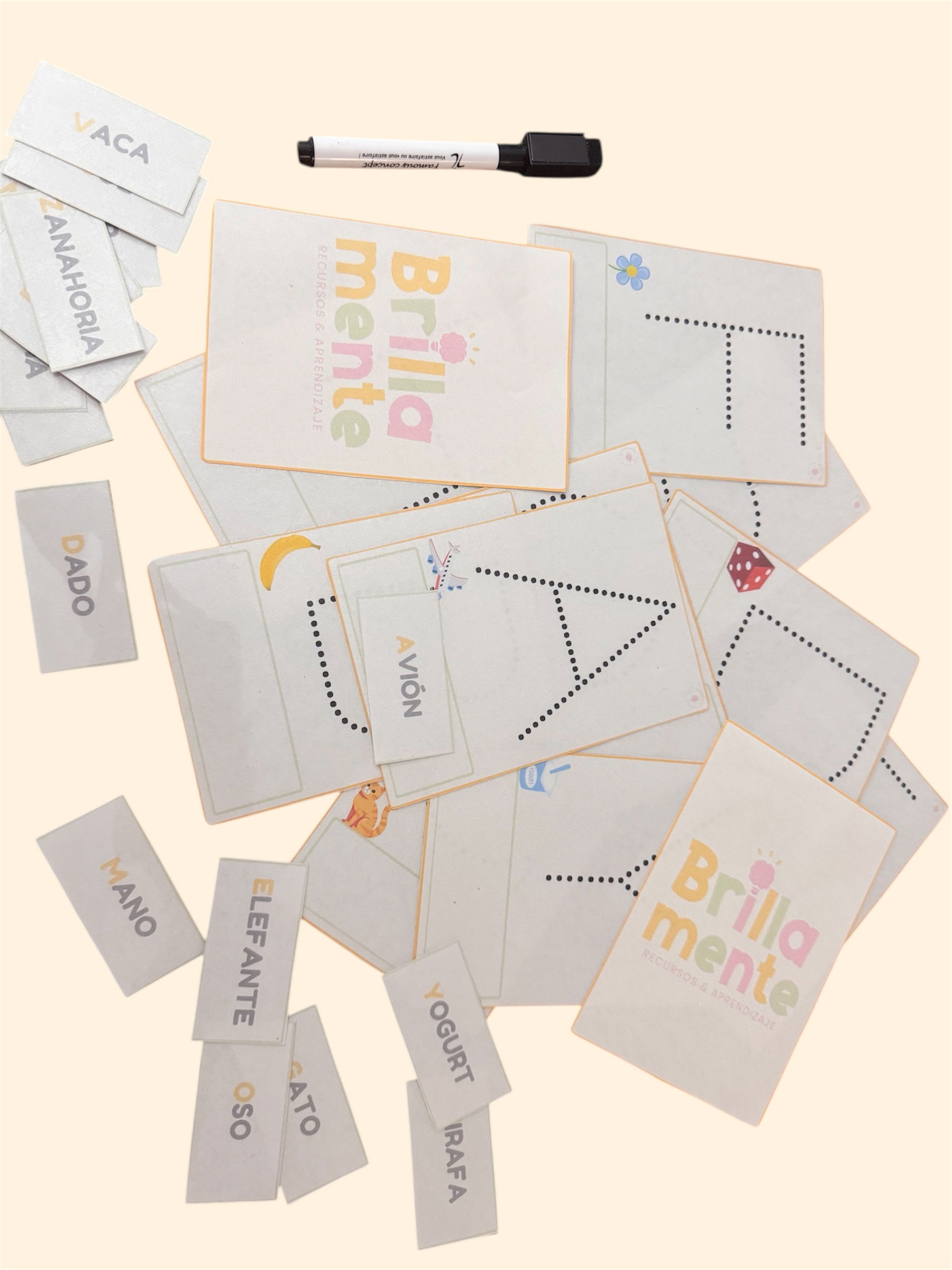 Incluye tarjetas de letras para trazar con guía de puntos y un pequeño dibujo referente para favorecer la asociación visual. Además, contiene tarjetas de palabras en mayúscula, ideales para trabajar reconocimiento, conciencia fonológica y vocabulario.