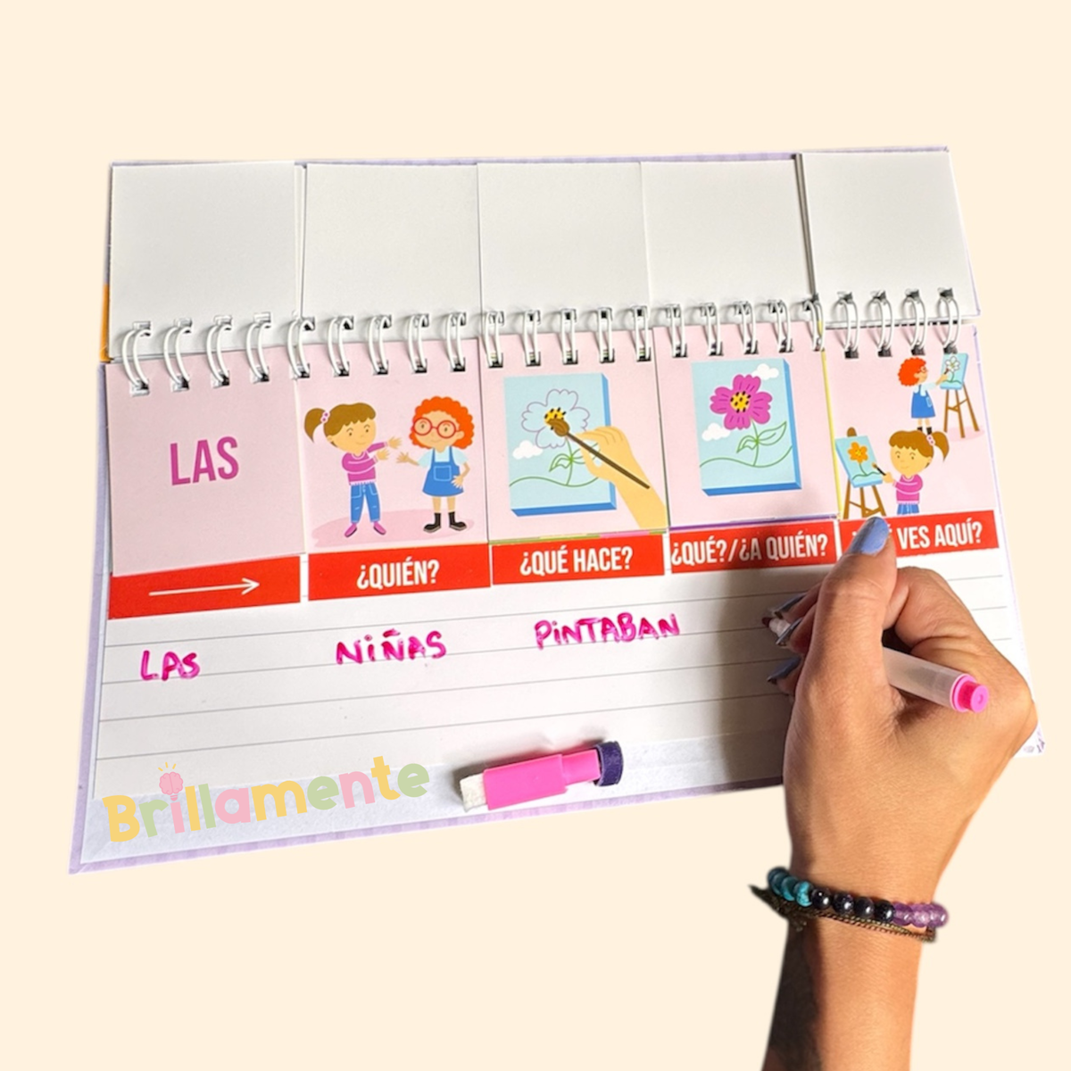 El libro móvil de oraciones es un recurso manipulativo e interactivo diseñado para favorecer la construcción de oraciones simples a partir de imágenes y preguntas guía. Cada solapa permite deslizar, descubrir y organizar información, ayudando al niño a comprender la estructura básica de una oración. A través de solapas con preguntas como ¿quién?, ¿qué hace? y ¿qué?