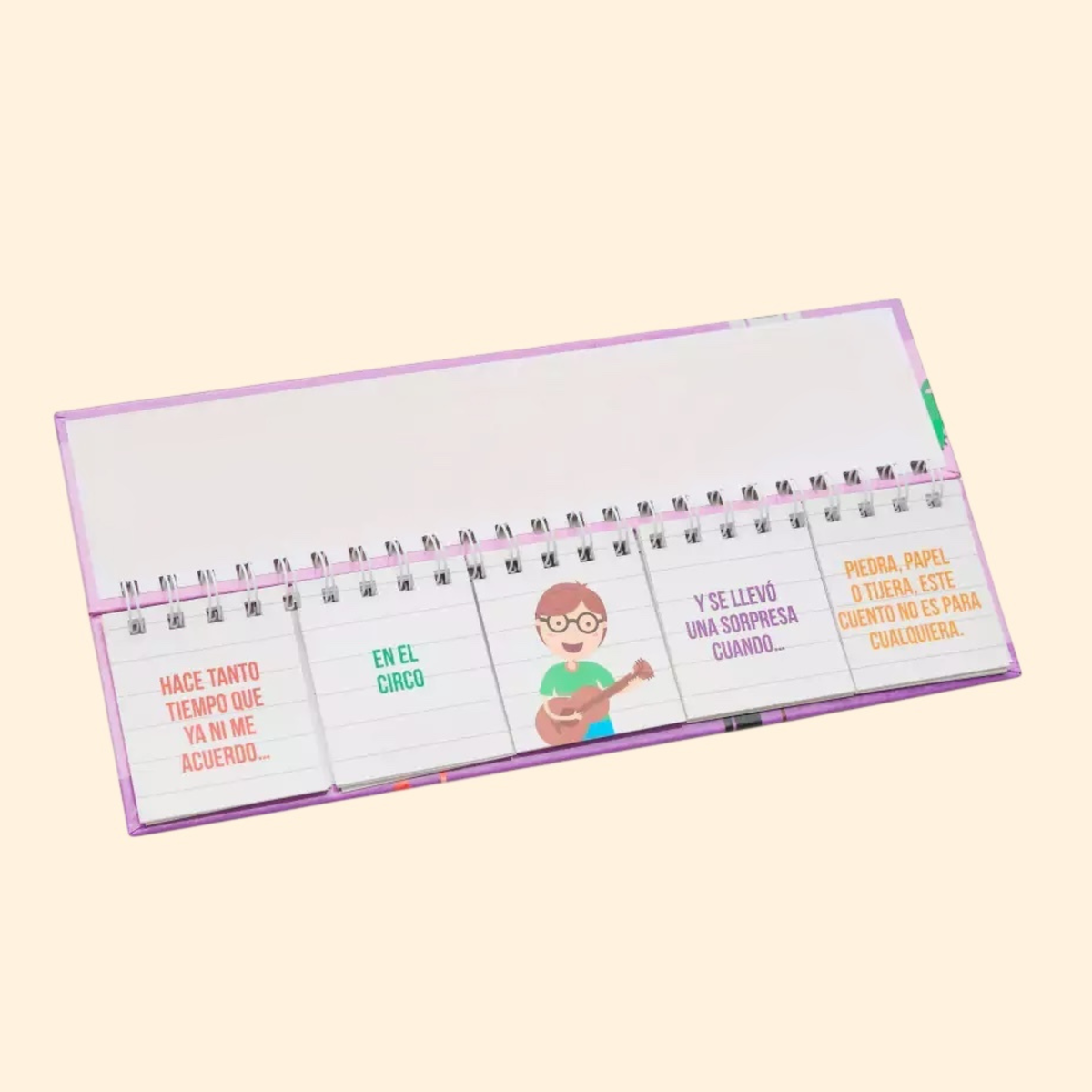 Cada página propone una frase disparadora que ayuda a armar el cuento de forma secuencial, respetando la estructura narrativa: Inicio, desarrollo- sorpresa/conflicto y cierre.